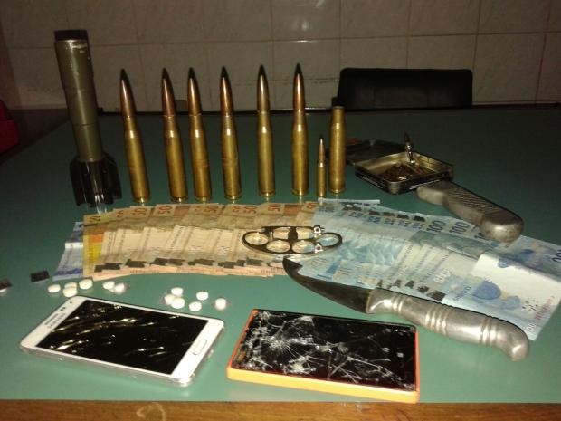 Conforme a BM, a abordagem foi feita em uma residência na Rua Virgínia Nicolau, por volta das 20h30min desta quarta-feira (02/03). No local, foi encontrada a granada, munição calibre 50 e 7.62, drogas, telefones celulares, uma faca e cerca de R$ 2 mil em dinheiro.